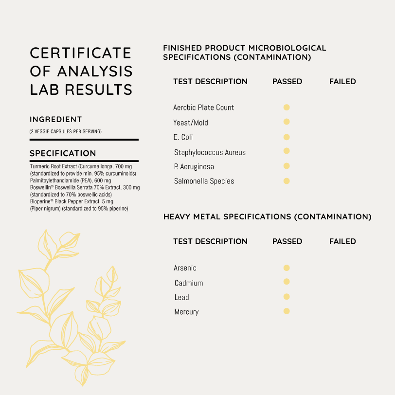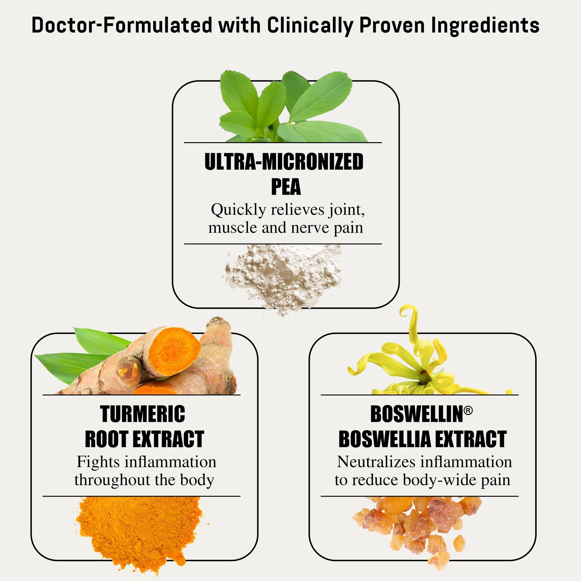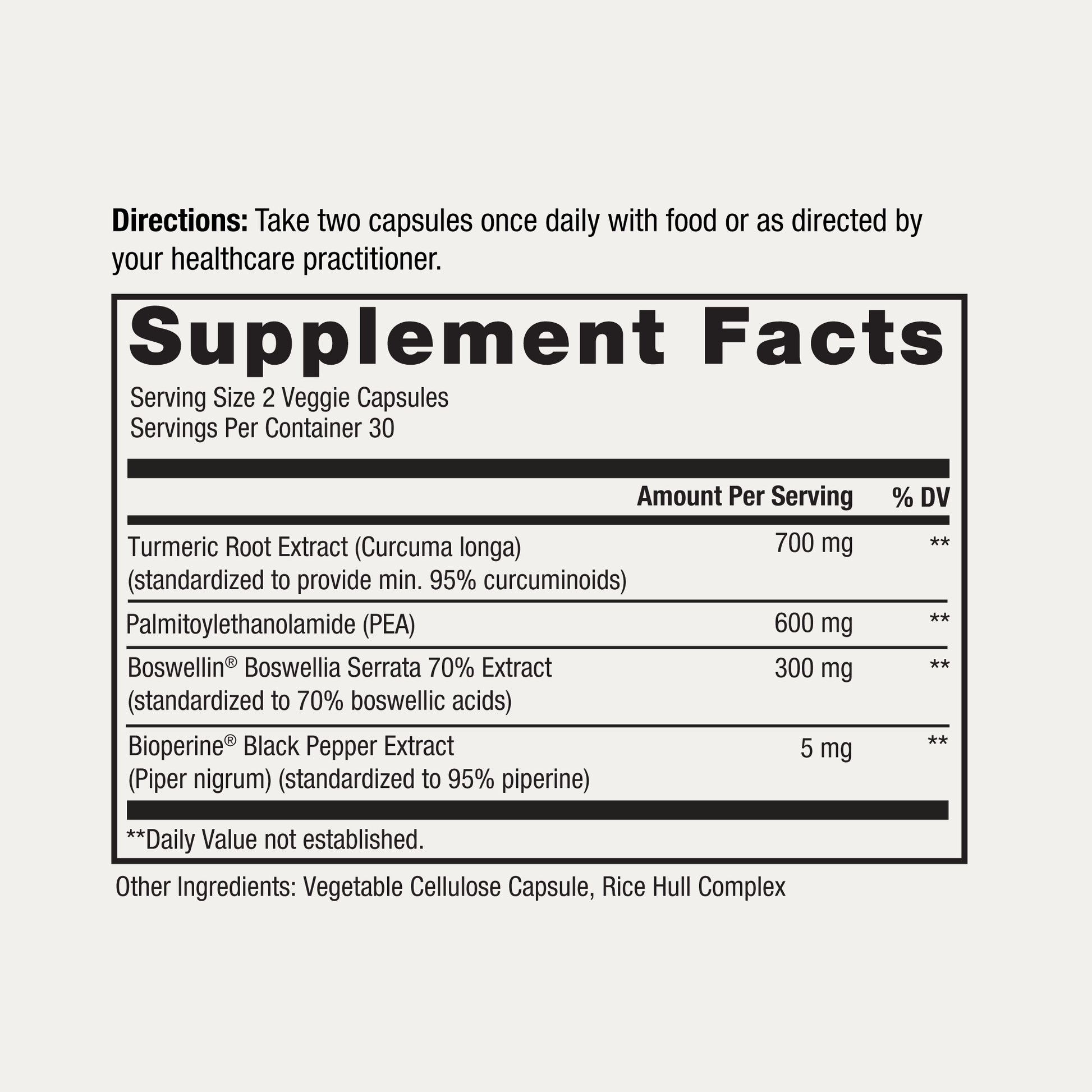 A triple-action formula that relieves pain naturally for your stiff, achy joints, muscles and back with three powerful and extensively researched natural inflammation fighters: PEA, turmeric and boswellia in their purest and most effective forms.*