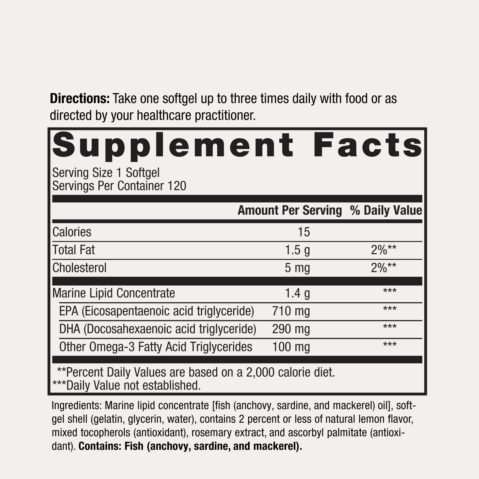 Just one softgel provides a potent, highly purified 1,000 mg dose of the key omega-3s EPA and DHA in a highly absorbable, natural triglyceride form. Made from sustainably sourced, cold-water fish and enhanced with natural lemon flavor.*